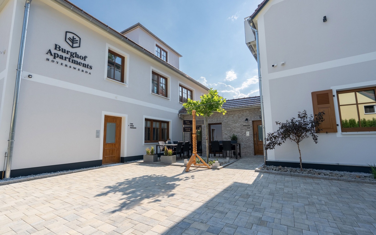 Auch im Hofquartier sind Hunde gern gesehen. Vierbeiner dürfen sich im Innen- und Außenbereich aufhalten, bitte stets angeleint. Wasser- und Futternäpfe stehen bereit, draußen sorgen schattige Plätze für zusätzlichen Komfort. Ruhige Sitzbereiche schaffen eine entspannte Atmosphäre, sodass Hunde während des Frühstücks am Tisch liegen können. Alternativ gibt es die Möglichkeit, den Hund an einer separaten Stelle sicher zu befestigen.