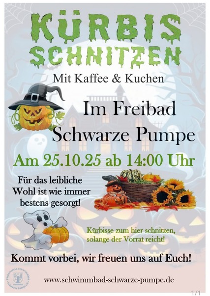 Am Samstag, den 25. Oktober 2025 ab 14:00 Uhr, lädt das Freibad Schwarze Pumpe zum traditionellen Kürbisschnitzen ein. In gemütlicher Herbststimmung können große und kleine Besucher kreative Kürbisgesichter gestalten – die passenden Kürbisse gibt es direkt vor Ort, solange der Vorrat reicht.