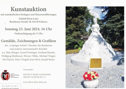 Am Sonntag, dem 23. Juni 2024 kommen im Romy Schneider Museum Schloss Klein Loitz Bilder namhafter Künstler unter den Hammer: »Zum Ersten, zum Zweiten, zum Dritten, verkauft…« Gemälde, Zeichnungen & Grafiken der "Leipziger Schule" , "Künstler des Bauhauses" und anderer internationaler Künstler, u.a. Max Klinger, Michael Triegel,Lyonel Feininger, Gerhard Marcks, Wolfgang Mattheuer, Werner Tübke, Marc Chagall, Joan Miró, Neo Rauch und Joseph Beuys.