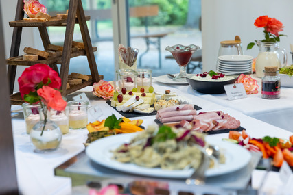 Die Gäste erwartet ein vielfältiges Buffet mit kalten und warmen Speisen, ergänzt durch eine Auswahl an frischem Kuchen. Filterkaffee sowie Wasser (still und sprudelnd) sind im Angebot enthalten.