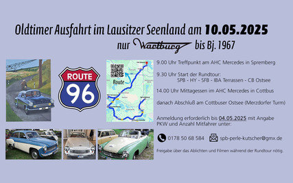 Am AHC Spremberg startet gegen 9:30 Uhr eine besondere Ausfahrt historischer Fahrzeuge: Wartburg-Typen 311/312/313 (bis Baujahr 1967) rollen über die B97 nach Hoyerswerda und weiter auf der B96 durch Schwarzkollm, Kleinkoschen, Senftenberg und Großräschen bis nach Cottbus. Drei kurze Stopps an regionalen Highlights sind geplant. Ein gemeinsamer Zwischenstopp mit Mittagessen findet im Mercedes AHC Cottbus statt, bevor die Tour gegen 16 Uhr am Merzdorfer Turm am Cottbuser Ostsee endet. Eingeladen sind ausschließlich Besitzer und Mitfahrer der genannten Wartburg-Modelle. Die Teilnahme ist kostenlos – die Verpflegung übernimmt der Sponsor, das Mercedes Autohaus Spremberg/Cottbus, jedoch ausschließlich für angemeldete Teilnehmer.