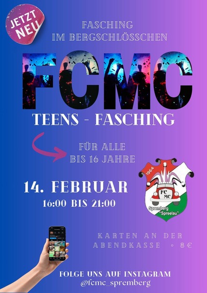 Der FCMC lädt herzlich alle Jugendlichen bis 16 Jahre zu einem besonderen Event ein: der Teens-Fasching im Bergschlösschen! Freut euch auf eine unvergessliche Feier voller Musik, Spaß und ausgelassener Stimmung. Lasst euch die Gelegenheit nicht entgehen, mit euren Freunden zu feiern und gemeinsam eine tolle Zeit zu verbringen.