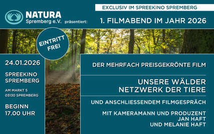 Der Verein NATURA Spremberg e.V. lädt zu einem besonderen Filmabend im SpreeKino Spremberg ein. Gezeigt wird der mehrfach preisgekrönte Naturdokumentarfilm "Unsere Wälder – Netzwerk der Tiere", der eindrucksvoll die verborgenen Zusammenhänge und die erstaunliche Vielfalt heimischer Wälder beleuchtet. Der Film macht sichtbar, wie eng Pflanzen, Tiere und Mikroorganismen miteinander verbunden sind und welche Bedeutung intakte Waldökosysteme für Mensch und Natur haben. Im Anschluss an die Filmvorführung sind die Besucherinnen und Besucher zu einem Filmgespräch eingeladen. Kameramann und Produzent Jan Haft sowie Melanie Haft geben dabei persönliche Einblicke in die Entstehung des Films, ihre Arbeit in der Natur und die Herausforderungen moderner Naturdokumentation. Der Filmabend richtet sich an Naturinteressierte, Familien und alle, die sich für Umwelt- und Artenschutz begeistern.