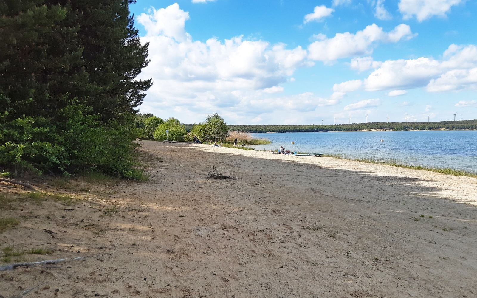 Erstmalig im Jahr 2017 hat die Stadt eine Zwischennutzung für Baden ab Mitte Mai bis in den Oktober eines jeden Jahres erhalten. Somit ist es möglich, rund 120m nahezu naturbelassenen Strand zu nutzen, geplant sind einmal 450m Strandlänge. Der etwa 10m breite Sandstreifen wird einmal im Jahr gepflegt und dient als Strand- und Liegefläche. In relativ kurzer Distanz zum Badestrand am Westufer sind PKW-Stellplätze vorhanden.
