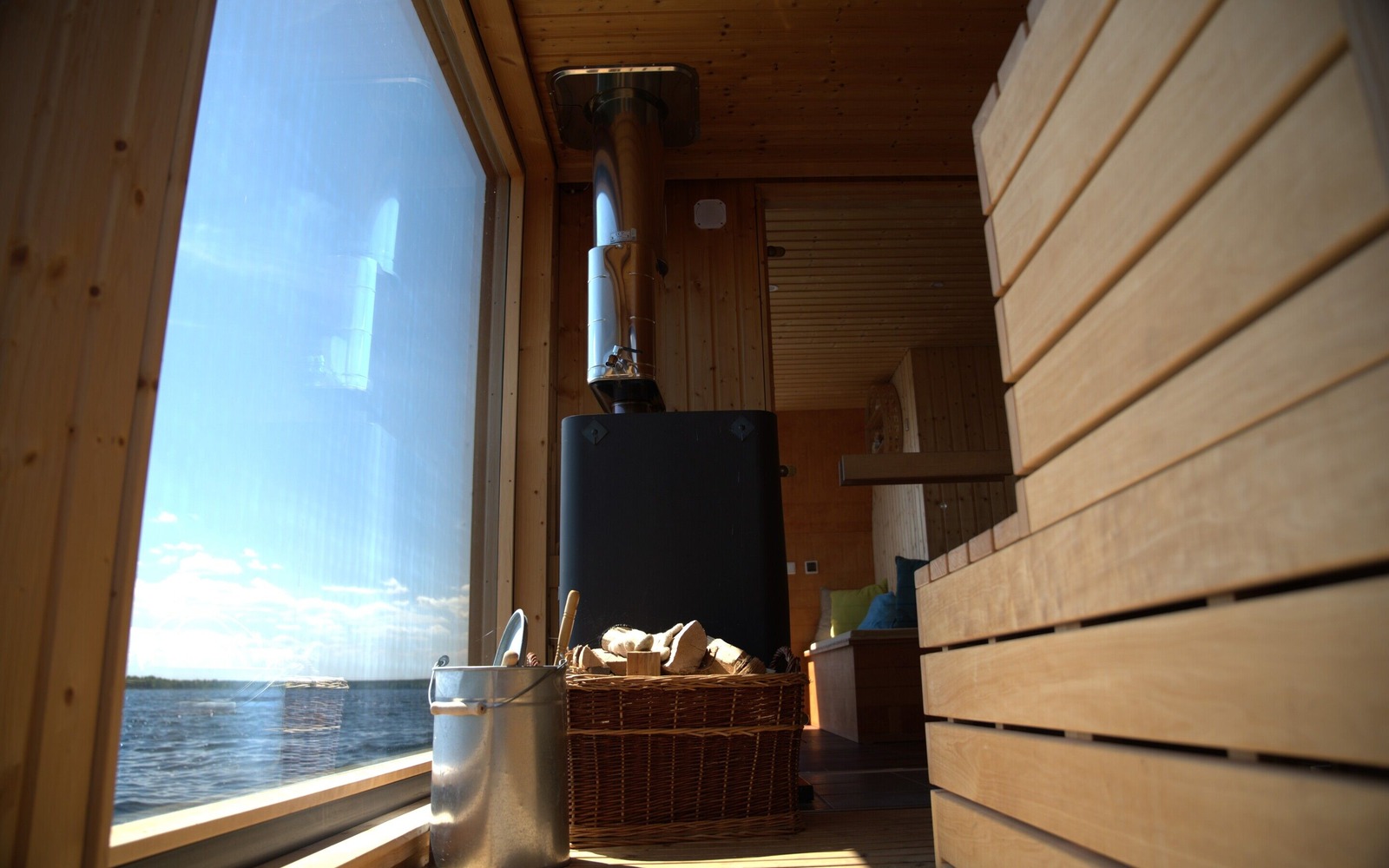 Die finnische Sauna an Bord erreicht Temperaturen von etwa 90° bis 120° Celsius. Während des Saunagangs eröffnet das Panoramafenster einen atemberaubenden Ausblick auf den Senftenberger See und die umgebende Natur. Die Saunaflöße sind zudem mit einer Lounge, Sitzmöglichkeiten, einem Kühlschrank sowie einem separaten WC mit Dusche ausgestattet. Auf den großzügigen Dachterrassen stehen Liegestühle bereit, um die Seele baumeln zu lassen.