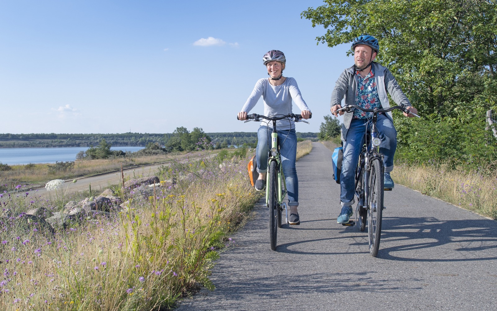 Die Landschaft des Lausitzer Seenlandes lässt sich über zahlreiche miteinander vernetzte und gut ausgebaute Radwege erkunden. Die Seerundwege sind breit, überwiegend flach und asphaltiert. Mit dem Rad bieten sich immer wieder einzigartige freie Blicke aufs Wasser. Auf der Seenland-Route, einem 191 Kilometer langen Fernradweg, sind alle Stadien der Flutung – vom stillgelegten Tagebau bis zum fertigen Seen mit Jachthafen und hellen Badestränden – zu sehen. Der Radweg durchzieht die Region von Nord nach Süd und wieder zurück.