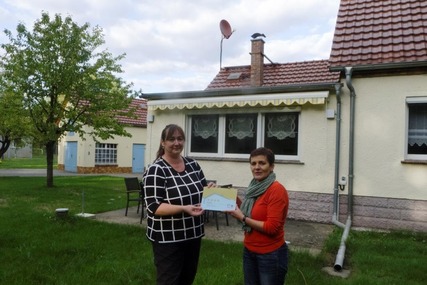 Bildunterschrift: Kathrin Winkler, Geschäftsführerin des Tourismusverbandes Lausitzer Seenland e.V. (rechts) übergibt die Urkunde und das Klassifizierungsschild an die Privatvermieterin Susanne Blei vor dem Ferienhaus in Hohenbocka