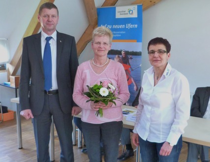 Bildunterschrift: Siegurd Heinze, Vorstandsvorsitzender des Tourismusverbandes Lausitzer Seenland e.V. und Kathrin Winkler, Geschäftsführerin des Tourismusverbandes Lausitzer Seenland e.V. (rechts) beglückwünschen Privatvermieterin Ursula Nittka (Mitte) aus Hohenbocka zur Reklassifizierung ihres Ferienhauses mit drei Sternen.