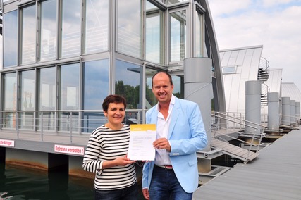 Bildunterschrift: Kathrin Winkler, Geschäftsführerin des Tourismusverbandes Lausitzer Seenland e.V. übergibt die Klassifizierungsurkunden an Holm Nehrig, Geschäftsführer des Lausitzer Seenland Resorts vor den schwimmenden Ferienhäusern