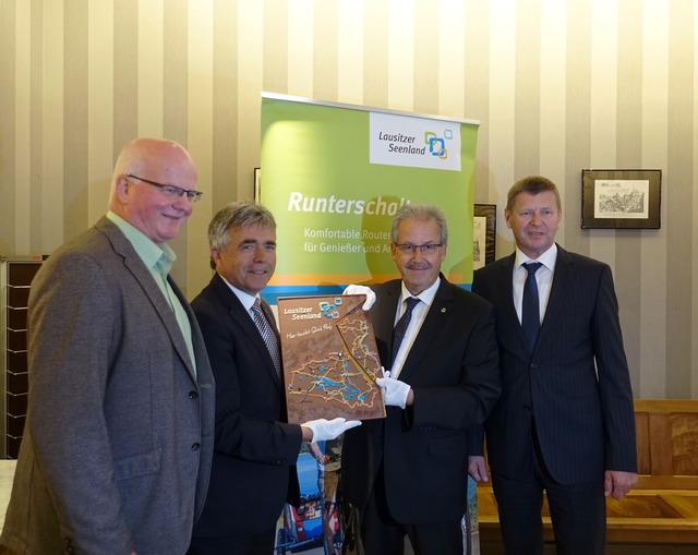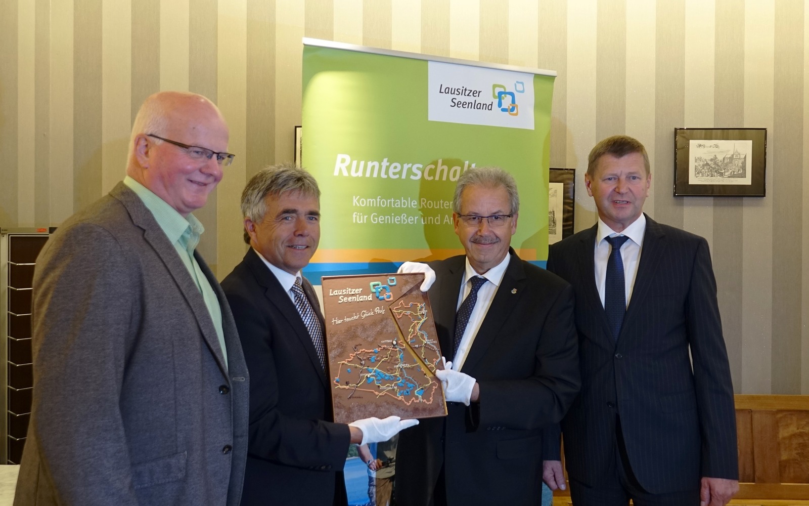 v.l.n.r.: Olaf Lalk, Vorstandsmitglied Tourismusverband Lausitzer Seenland e.V und 1. Beigeordneter Landkreis Spree-Neiße, Michael Harig, Vorstandsvorsitzender Tourismusverband Lausitzer Seenland e.V. und Landrat Landkreis Bautzen, Harald Altekrüger, Landrat Landkreis Spree-Neiße, Siegurd Heinze, stellvertretender Vorstandsvorsitzender Tourismusverband Lausitzer Seenland e.V. und Landrat Landkreis Oberspreewald-Lausitz