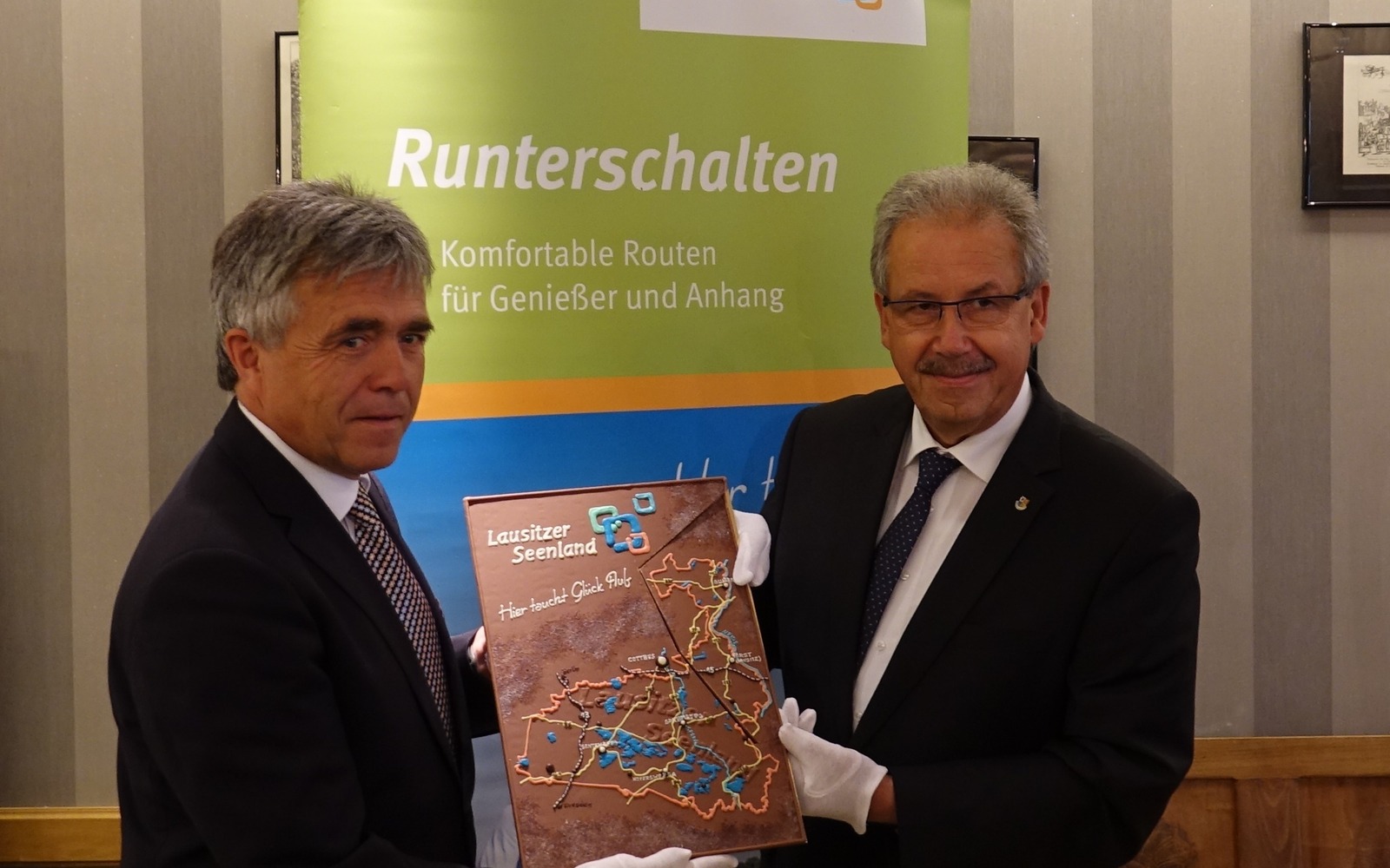 v.l.n.r.: Michael Harig, Vorstandsvorsitzender Tourismusverband Lausitzer Seenland e.V. und Landrat Landkreis Bautzen, Harald Altekrüger, Landrat Landkreis Spree-Neiße