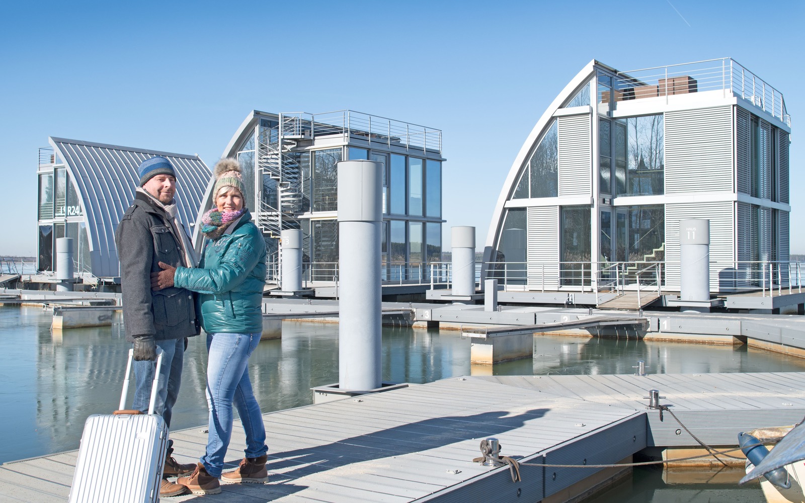 Das Wasser nicht nur sehen, sondern auch spüren können die Bewohner der schwimmenden Ferienhäuser im Lausitz Resort, wenige Meter vom Leuchtturm-Hotel entfernt. Die Ferienhäuser auf unsinkbaren Pontons bieten Platz für zwei bis acht Gäste. Auf der Terrasse oder dem Sonnendeck fühlt man die sanften Bewegungen des Sees und genießt bei Tee oder Glühwein die Stille, die Weite und die Wintersonne. Auch am Partwitzer See und am Gräbendorfer See gibt es schwimmende Häuser.