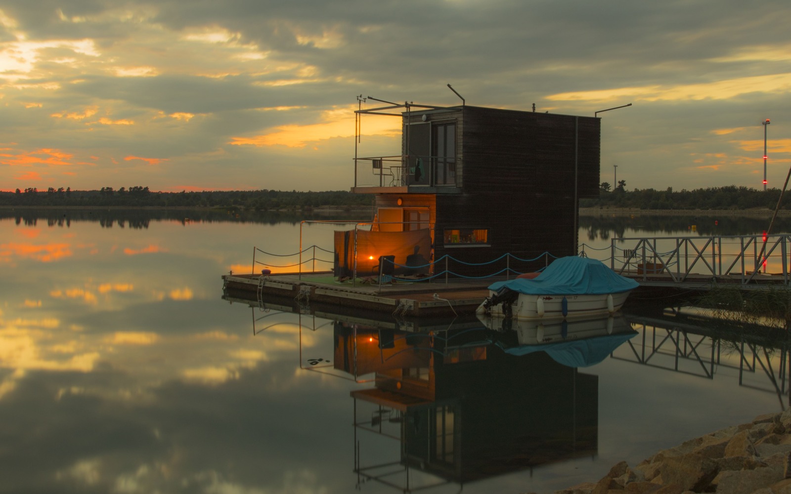 Partwitzer See: Sonnenuntergang auf der Terrasse des Schwimmenden Hauses