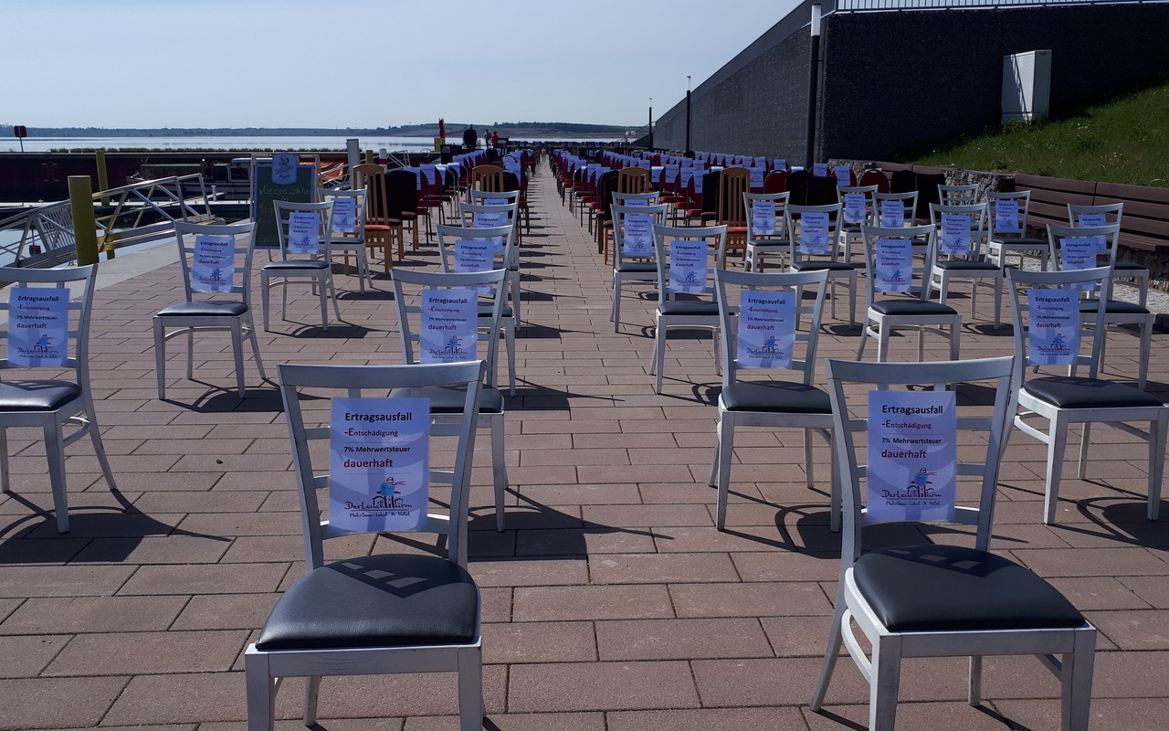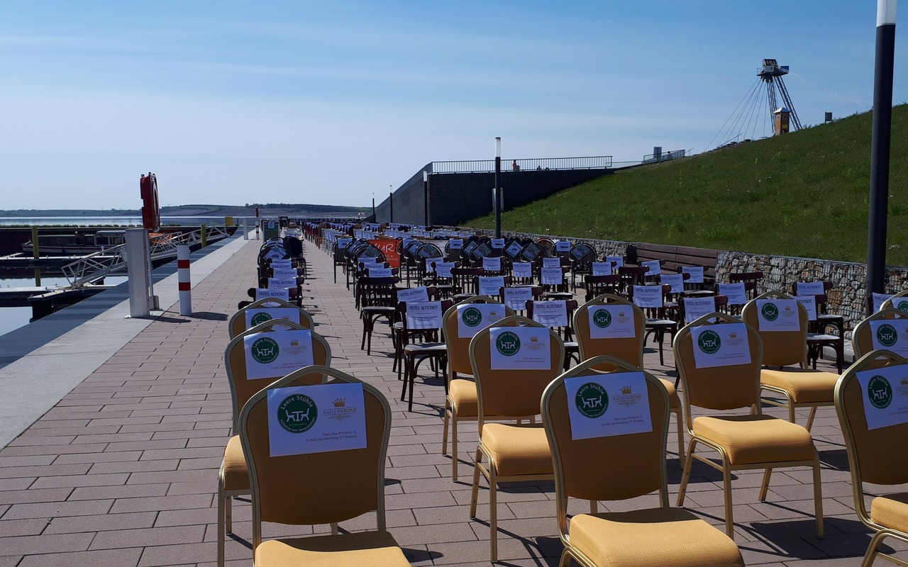Aktion Leere Stühle macht auf die Notlage der Gastronomen, Hoteliers und Veranstalter im Lausitzer Seenland aufmerksam
