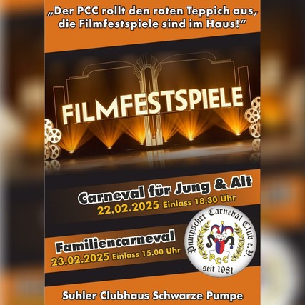 Der Pumpscher Carneval Club e.V. rollt den roten Teppich aus und lädt zu einer glamourösen Faschingsnacht unter dem Motto "Filmfestspiele" ein! Gäste erwartet eine unvergessliche Veranstaltung mit beeindruckenden Showeinlagen, mitreißender Musik und bester Stimmung. Ob Hollywood-Diva, Actionheld oder Kultfigur – kreative Kostüme sind ausdrücklich erwünscht! Ein Abend voller Spaß, Tanz und Überraschungen erwartet alle Faschingsfreunde. Seid dabei, wenn der PCC das Faschingskino eröffnet und gemeinsam gefeiert wird!