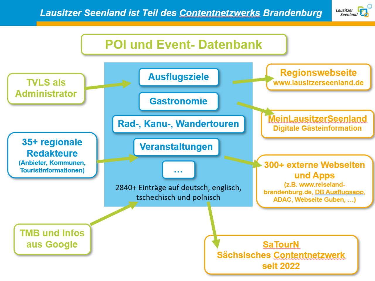 Das POI-Datenbank der Tourismus Marketing Brandenburg GmbH (TMB) ist die zentrale Datenbank für touristische POIs („Points of Interest“) im Land Brandenburg, die vom Tourismusverband länderübergreifend für das gesamte Reisegebiet Lausitzer Seenland gepflegt und verwaltet wird. Für die Zusammenarbeit wurde eine Vereinbarung mit der TMB abgeschlossen. Sowohl die POIs im brandenburgischen als auch sächsischen Teil des Lausitzer Seenlandes werden in den Kanälen des mit der Datenbank verknüpften Contentnetzwerks dargestellt und erreichen damit mittlerweile über 1.500 digitale Kontaktpunkte.