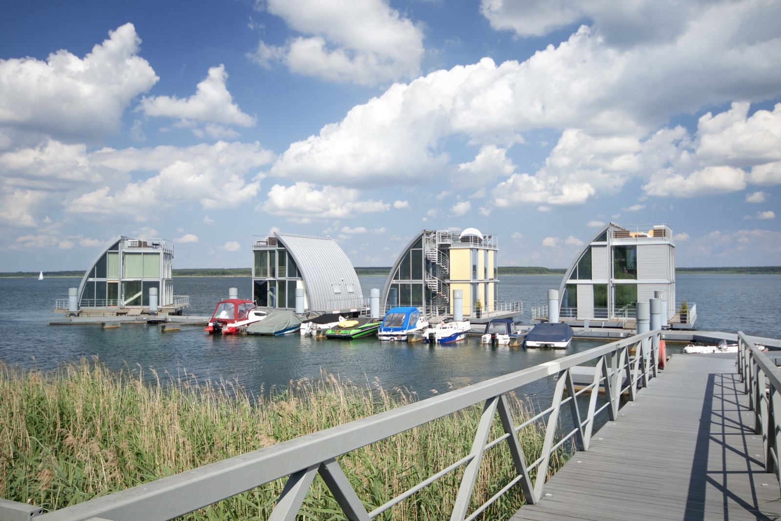 Bereits zu Beginn warb die IBA für schwimmende Häuser im Lausitzer Seenland als Markenzeichen. Eines der ersten Projekte waren 2009 die schwimmenden Ferienhäuser auf dem Geierswalder See.