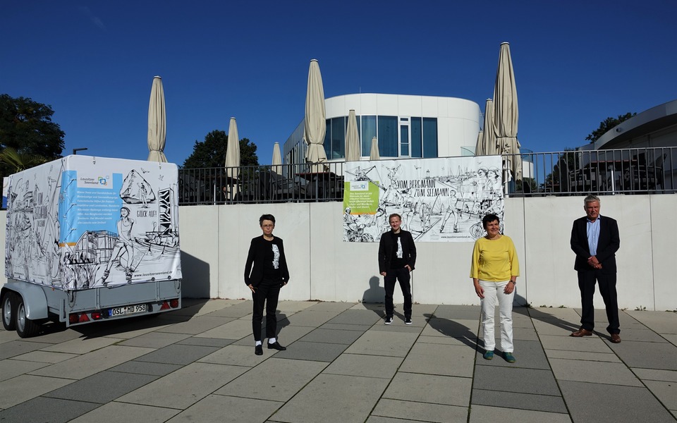 BU: Franka Just und Steffen Kazmierczak von der Agentur Die Piktografen GmbH, Kathrin Winkler, Geschäftsführerin des Tourismusverbandes Lausitzer Seenland e.V. und Dr. Klaus Freytag, Lausitzbeauftragter des Ministerpräsidenten des Landes Brandenburg (v.l.n.r.) stehen vor den entstandenen Werbemitteln der Kampagne "Vom Bergmann zum Seemann"