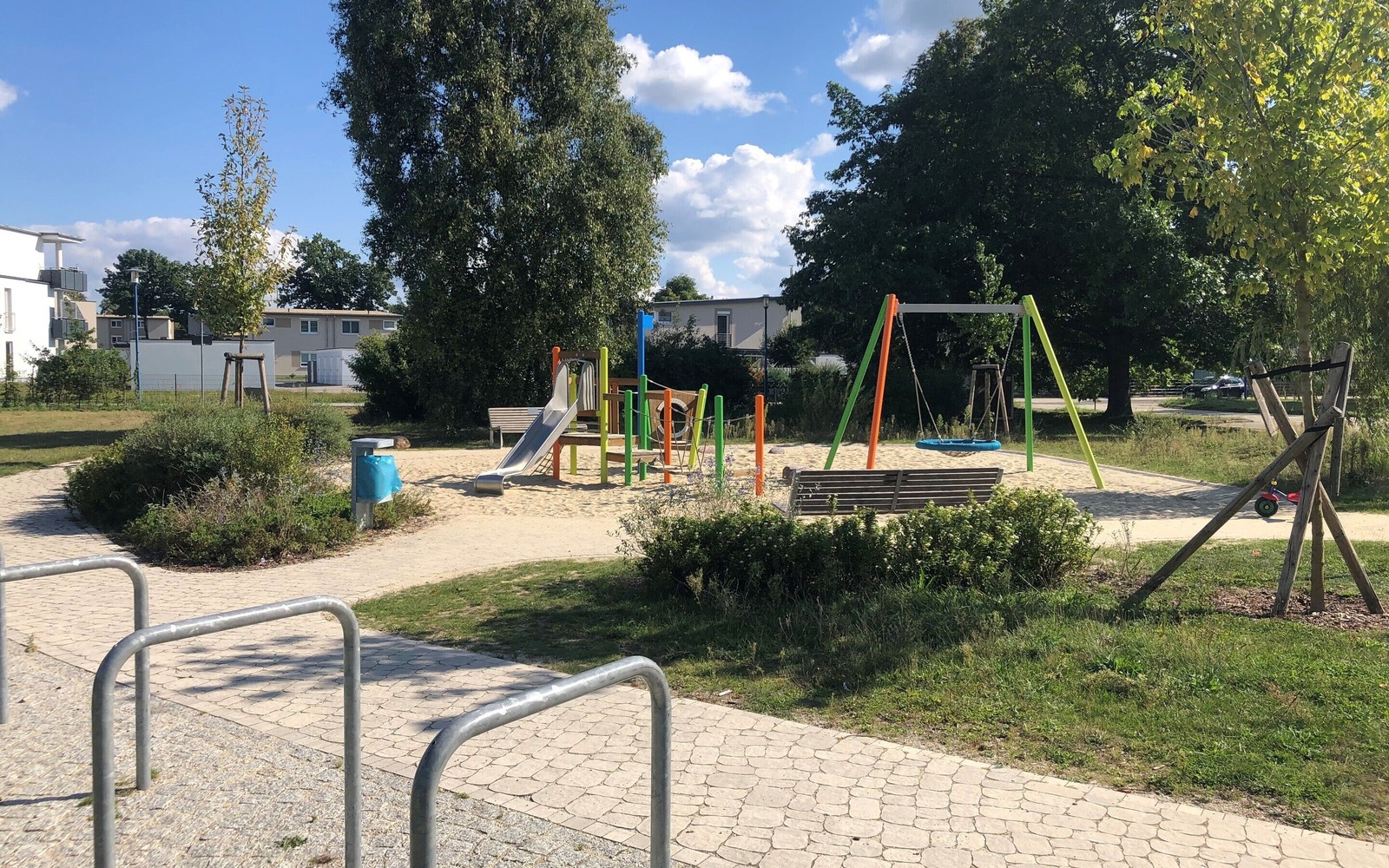 The playground is located in a well-maintained, traffic-calmed area and consists of several age-appropriate play areas. For toddlers, there is a play area with a small climbing frame, a slide, and various balancing and climbing elements. The ground is covered with fine sand, which provides additional safety. In the immediate vicinity is a double swing with a disc-shaped net seat, suitable for several children at the same time.
