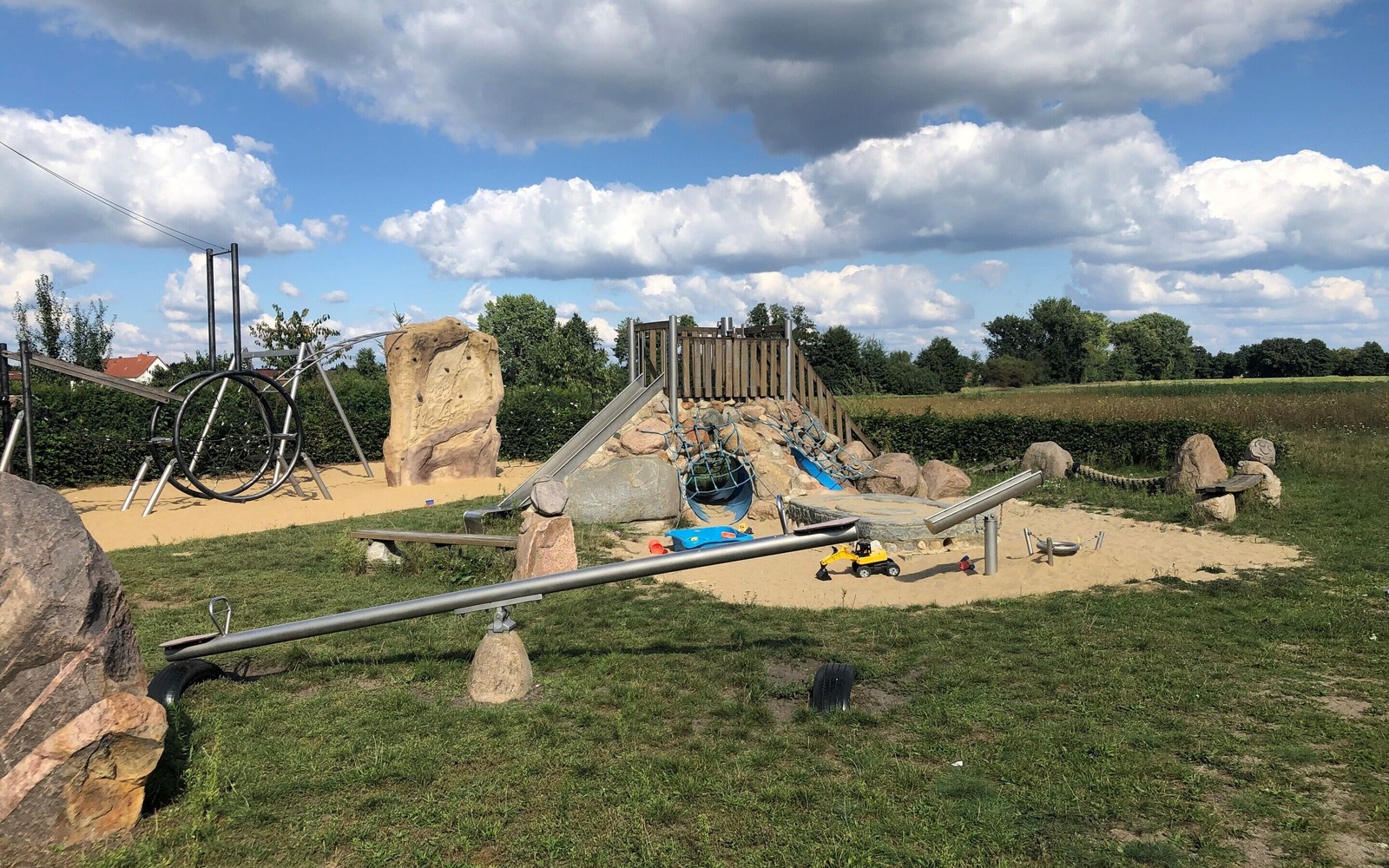 The playground offers a wide range of activities and experiences. Climbing frames with ropes, slides, and balancing equipment invite children to try them out. The area is complemented by a sandpit with seesaws, a small toboggan run, and natural play elements made of wood and stone.