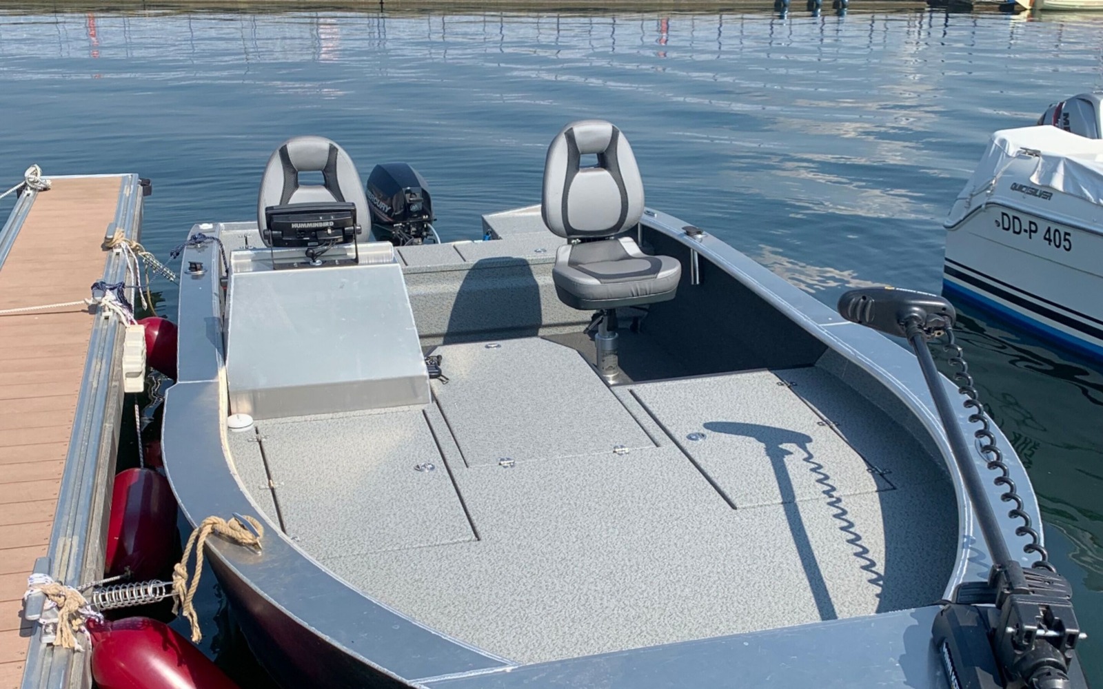 The licence-free aluminium boat Pike Hunter 530 is equipped with an 8-inch Humminbird Echolot, a 15 horsepower boat engine, an i-Pilot bow thruster and a landing net.